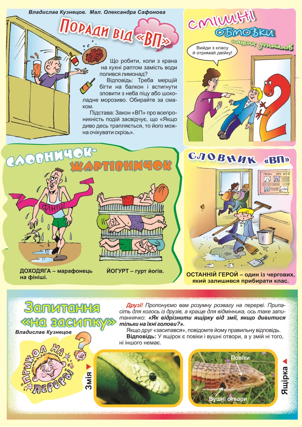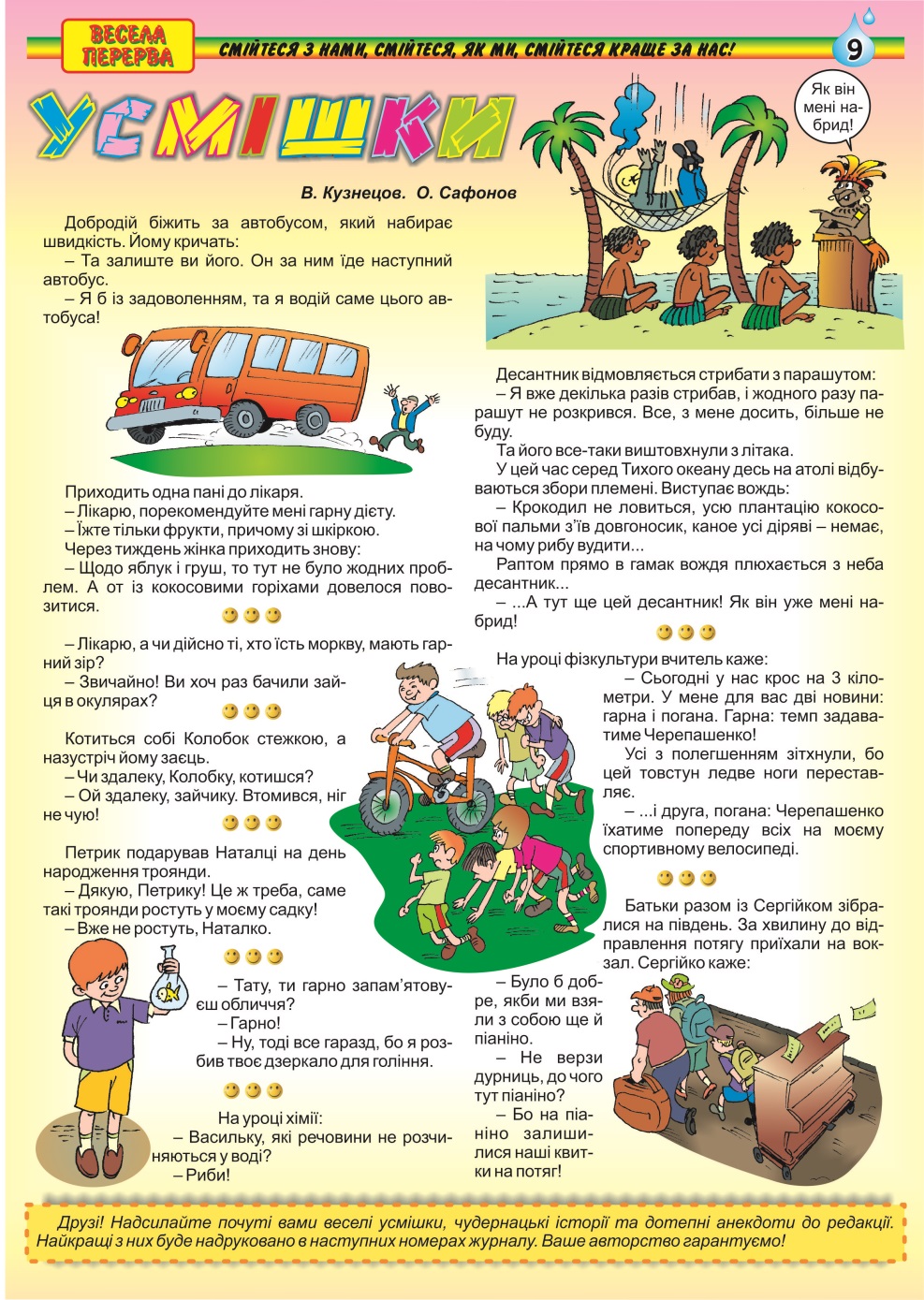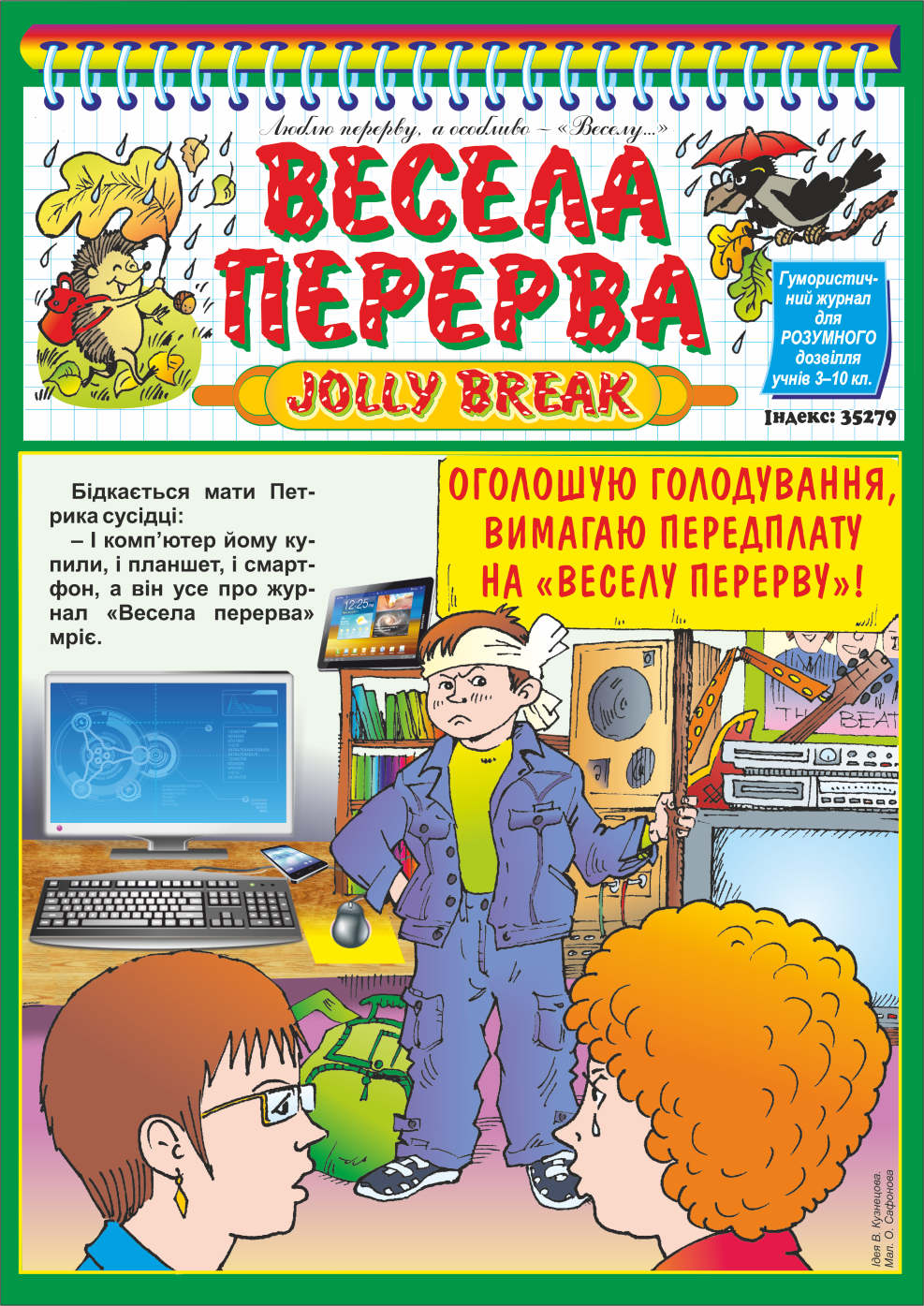 | ВЕСЕЛА ПЕРЕРВА – JOLLY BREAK (укр., англ.) Пізнавально-гумористичний журнал для учнів 3–10 кл. ІГРОВЕ НАВЧАННЯ, уроки ерудитів, кросворди та ребуси з різних предметів, весела фізика, підказки з української, наукові приколи, тест «IQ» на перерві. ВЧИМО АНГЛІЙСЬКУ ГРАЮЧИ! (Передплатний індекс 35279). |